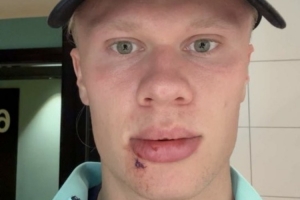 哈兰德在今日通过社媒晒出自拍照,可以清晰看到嘴唇下的伤口,他对此解释称:“刚刚被大巴车门给撞了👍缝了三针😂”