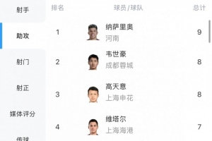 体育资讯9月22日讯 中超第25轮昨晚结束,助攻榜方面,本轮贡献一次助攻的河南队外援纳萨里奥9次登顶,韦世豪、高天意8次。