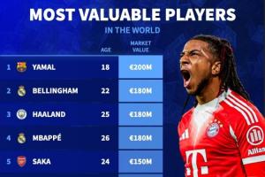 在西甲、意甲、法甲、德甲身价更新后,目前世界前20身价的球员如下。