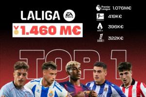 西甲是欧洲青训球员总市场价值最高的联赛,达14.6亿欧元,远超英超(10.7亿欧元)、德甲(9.6亿欧元)、意甲(8.9亿欧元)及法甲(7.6亿欧元)。在2025年夏季转会窗口中,西班牙俱乐部通过本土青训球员转会创下2.89亿欧元的收入纪录,创历史新高,印证了其青训战略的成功。