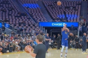 赛前热身环节,勇士球星库里在中圈出手,皮球精准入筐。
