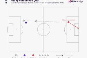据Opta统计,范德芬带球跑动67.7米之后破门,这是2015年Opta统计相关数据以来,欧冠带球距离最远的进球。
