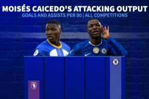 体育资讯11月5日讯 本赛季凯塞多在进攻端发挥越来越好,德转也盘点了球员生涯每90分钟参与进球数据(各项赛事进球+助攻),其中来到英超后逐年递增,具体如下:
