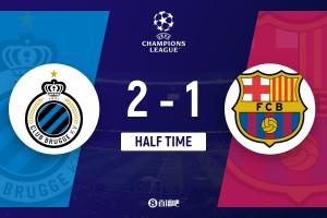 上半场伤停补时2分钟,半场结束,巴萨暂1-2布鲁日。