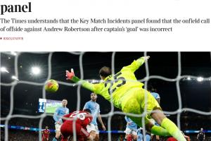据悉,专家小组支持利物浦的立场,这一结果势必会引发利物浦对此判罚的新一轮不满。《泰晤士报》获悉,专家小组认定场上裁判组的越位判罚不正确,但认为当值VAR奥利弗没有推翻此球的原有判罚是正确的