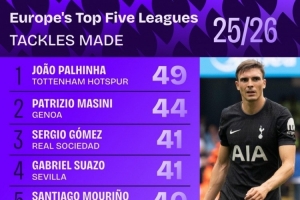体育资讯11月21日讯 Squawka统计了本赛季球员在五大联赛成功抢断的次数,并列出榜单,帕利尼亚49次居首。