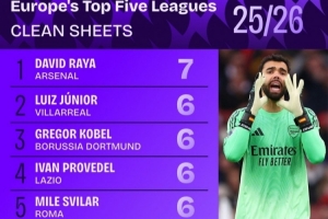 体育资讯11月21日讯 五大联赛战火即将重燃,数据机构squakwa也统计了本赛季五大联赛门将零封场次榜,枪手门将拉亚居首。